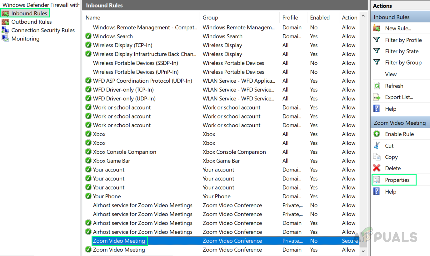 Opening Windows Defender Firewall Advanced Settings - Select Inbound Rules, scroll to Zoom Video Meeting, and select it. On the right, click Properties.