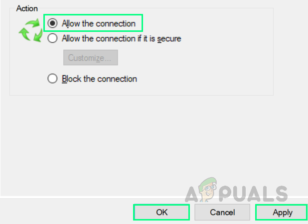 Opening Advanced Firewall Settings of the Zoom App - Choose Allow the connection, click Apply, then OK. This gives the Zoom application full internet access through the firewall.