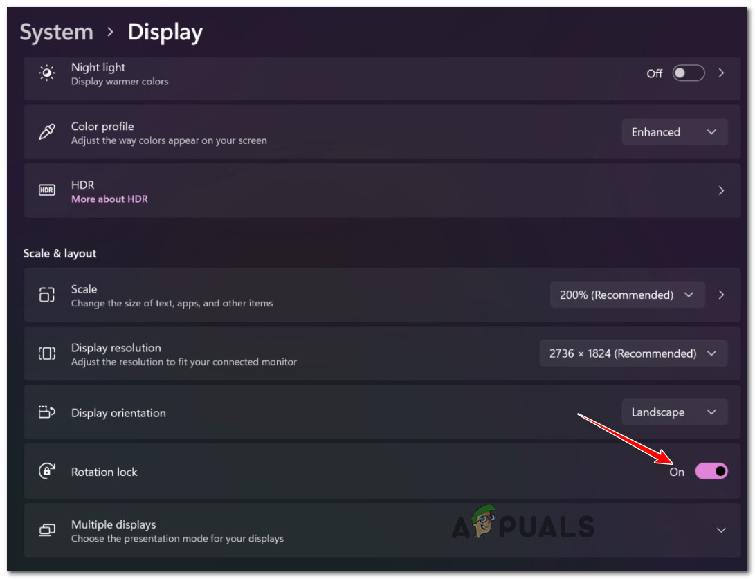 - In the Display settings, scroll down to Scale & layout and turn off the toggle for Rotation lock.