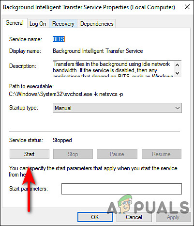 Double-click on the BIT service - In the Properties window, check if the Startup status lists Stopped. If so, click on Start and then click OK. If the service is already running, then click on the Restart button and hit OK.
