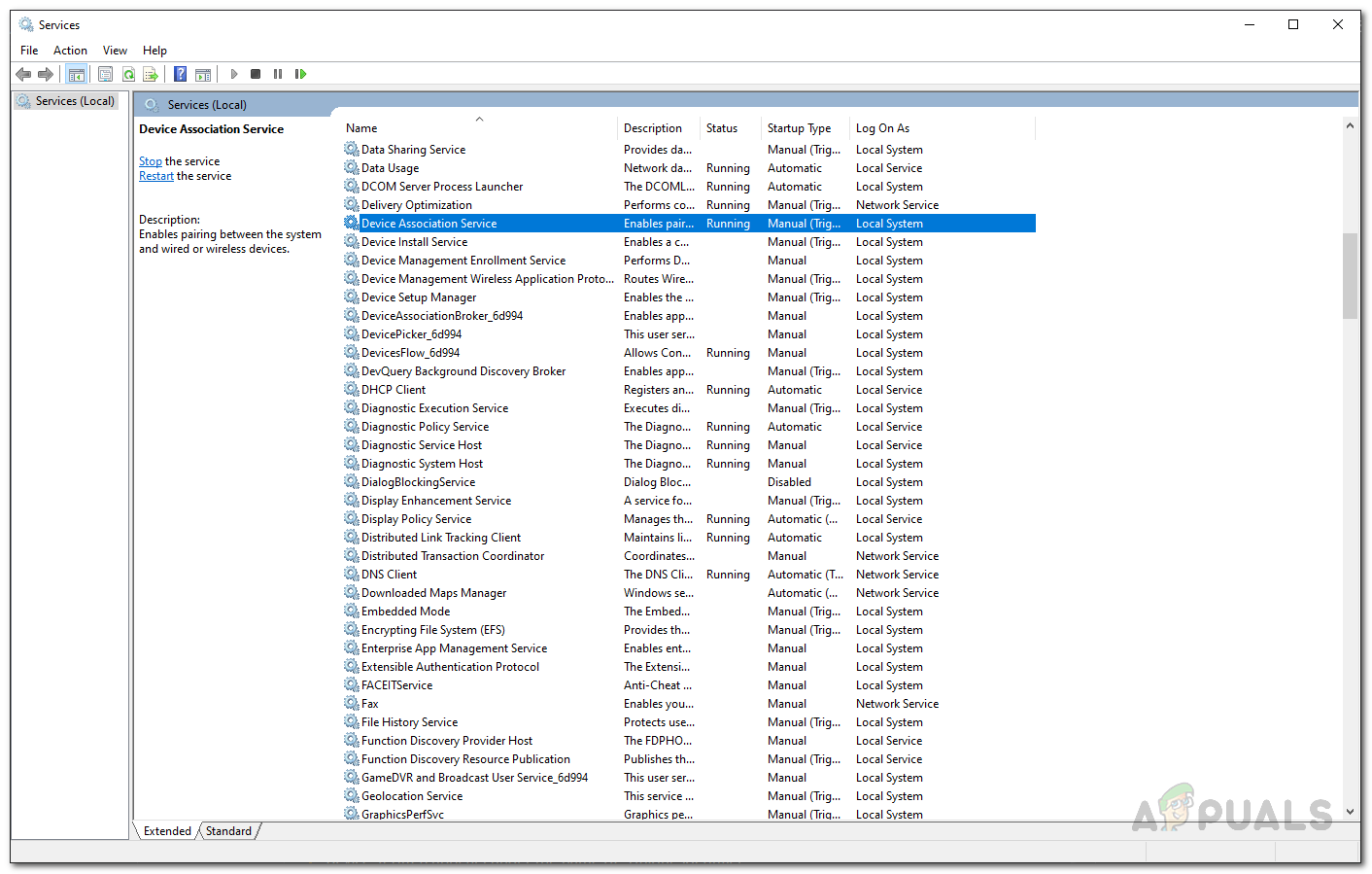 - From the list of all the services shown, locate the Device Association Service. To make this easy, simply press the D key which will take you to the services starting from the letter D.