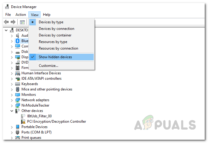 - Once the Device Manager window is open, click on the View option in the menu bar and then click on the Show hidden devices option.