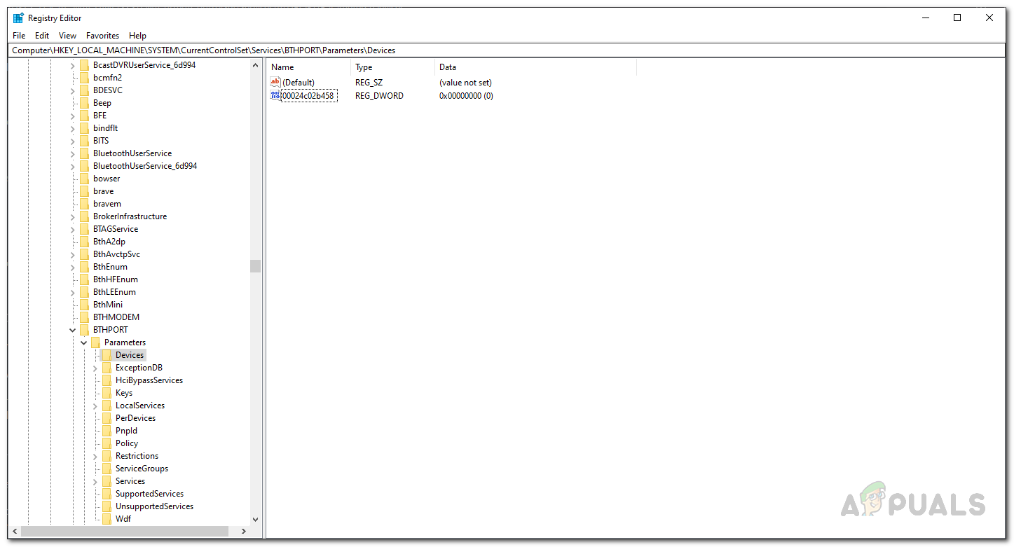 Computer\HKEY_LOCAL_MACHINE\SYSTEM\CurrentControlSet\Services\BTHPORT\Parameters\Devices