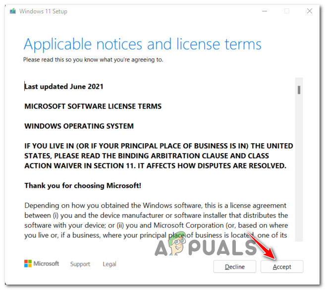 Accepting the Windows 11 EULA - Once you get to the next screen, select the Keep personal files and apps toggle, then click Next one final time.