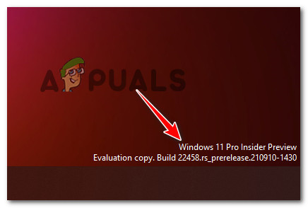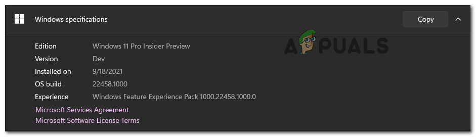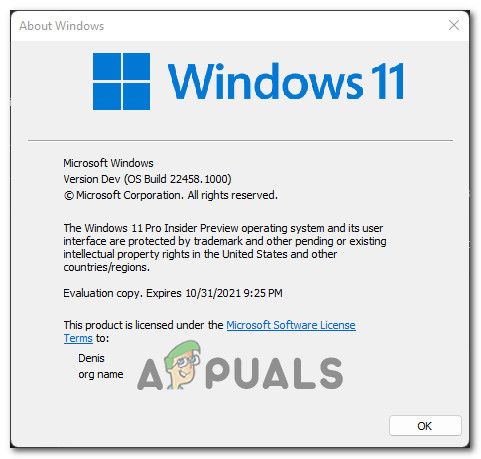 Note: If for some reason, you are unable to access your Settings menu, you can also check your current build by pressing Windows key + R and running ‘winver’. Once you’re inside the About Windows tab, check the current dev channel build under Version Dev.