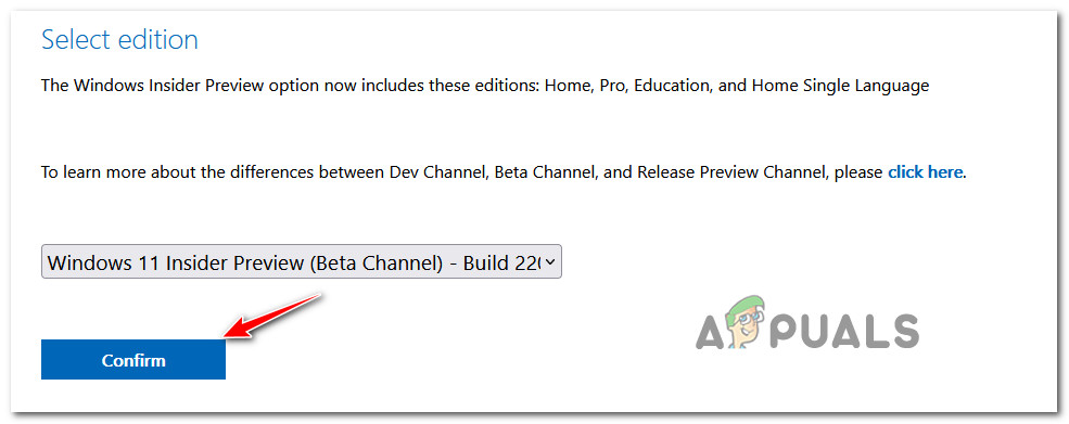 - Next, scroll down to the Select edition category, then use the Select Edition drop-down menu to pick up the Windows channel that you want to fall back to. Once you picked the correct edition, hit Confirm.