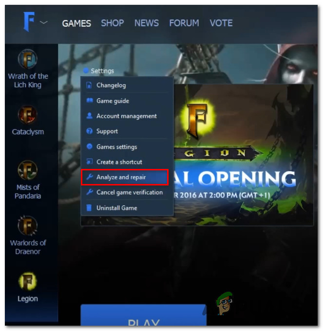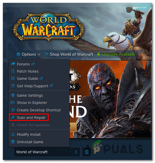 - Corrupted installation inside Battle.net or FireStorm – As it turns out, this type of issue is often reported to occur as a direct result of some type of corruption that’s affecting the local installation of WOW. In this case, depending on your launcher (Battle.Net or Firestorm), yous should be able to fix the problem by using the Analyse & Repair or Scan & Repair function respectively.