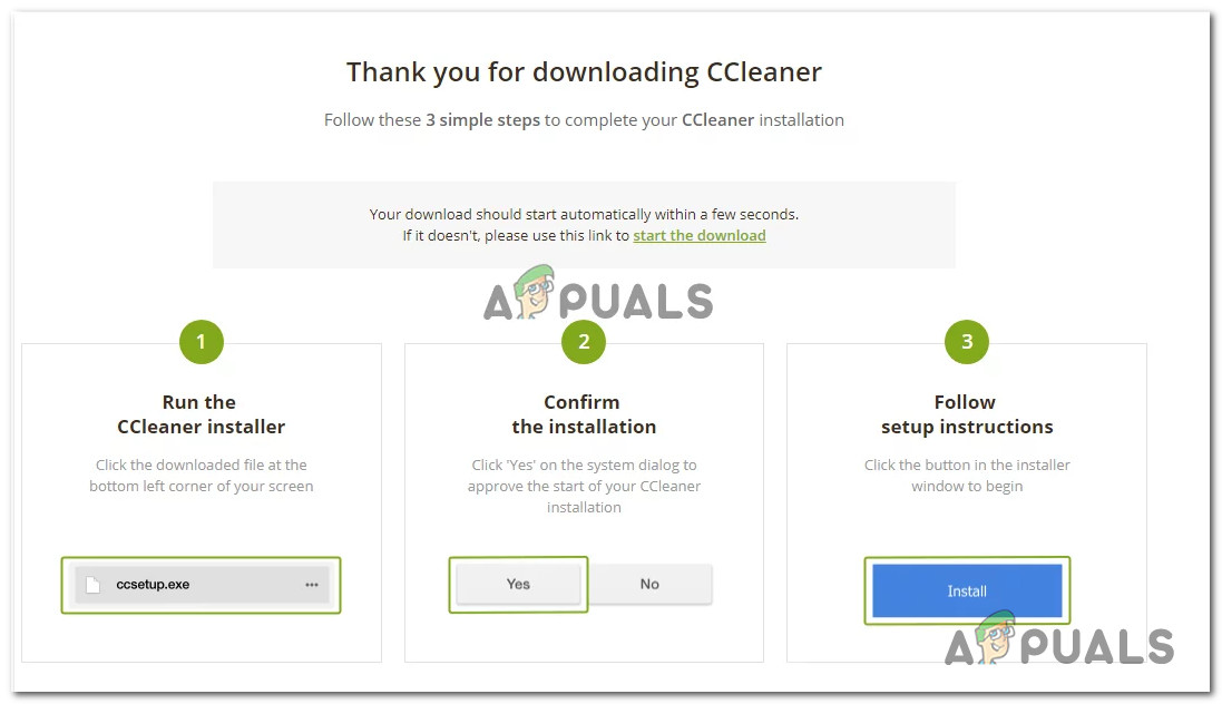 Downloading CCleaner - Once the installer is completely downloaded, double-click on it and hit Yes at the UAC prompt to grant the necessary permissions to complete the uninstallation.