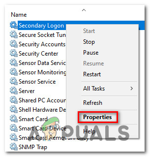 Accessing the Services screen - Once you’re inside the Services screen, scroll down through the list of services and locate the Secondary Logon service. Once you see it, right-click on Properties from the context menu that just appeared.