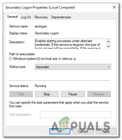 Properties screen of Secondary Logon Service - Once you’re inside the Properties screen, click on the General tab from the menu at the top, then change the Startup type to Automatic and hit Apply to save the changes.
