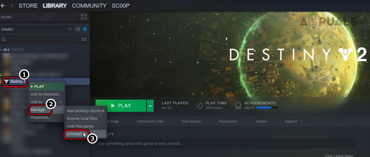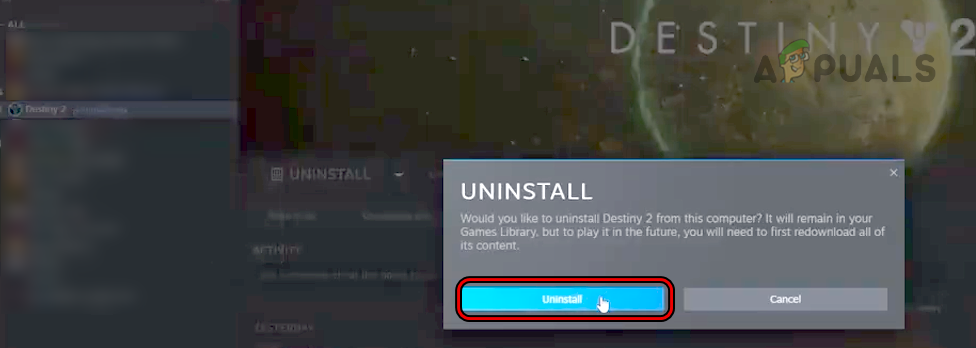 Confirm to Uninstall Destiny 2 on Steam - Upon restart, launch the Steam client and install the Destiny 2 game. Keep in mind that it will be a huge download (100 GB or more) and may take time (if your internet is not fast enough). Make sure the system does not go to sleep during the download process, otherwise, it may cause different issues including the cat error.