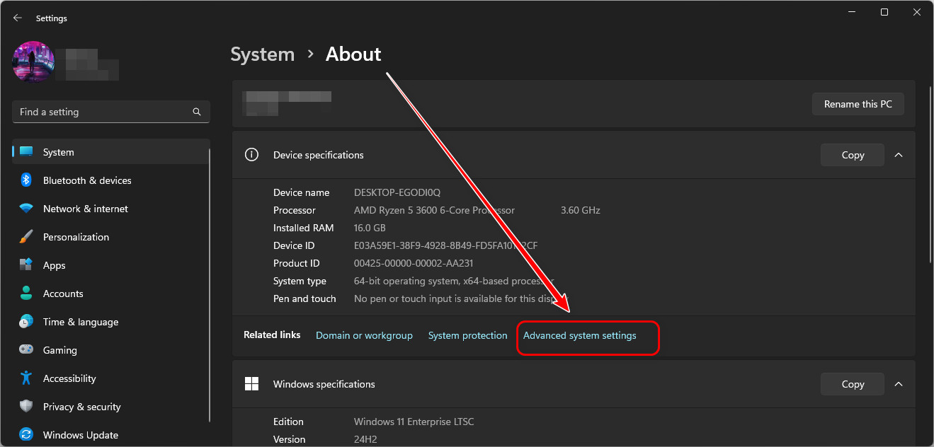 - In the same Properties window, navigate to System > About > Advanced System Settings.