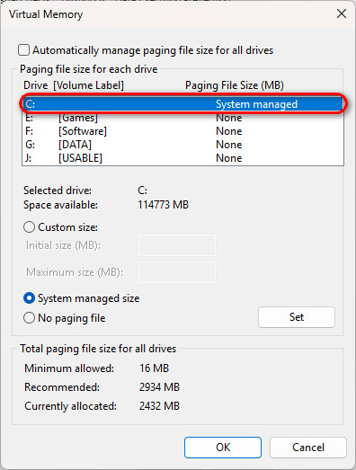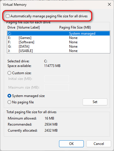 - Uncheck Automatically manage paging file size for all drives.