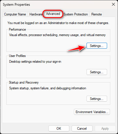 - In the Advanced tab, click on Settings under the Performance section.