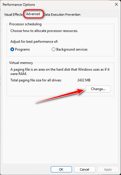 - In the Performance Options window, go to the Advanced tab. At the bottom, you’ll see Virtual Memory—click on Change.