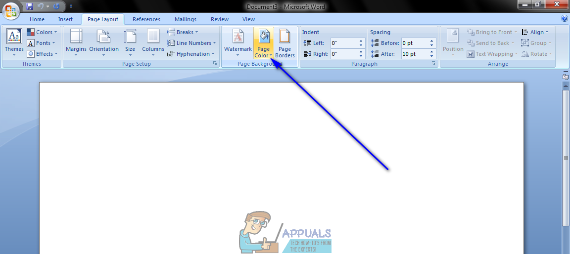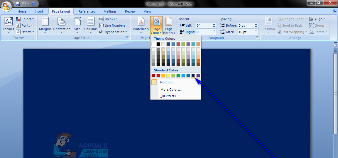- Locate and click on the color you want the color of the document’s background changed to. You can choose from a specific set of Standard Colors, or a set of Theme Colors that vary from user to user depending on what Theme they are using. You can view and/or change your Theme by clicking on Themes in the Themes section of the same Page Layout or Design tab the Page Color button is located in. Once you click on the color you desire, the background color of the document in question will be changed to it.