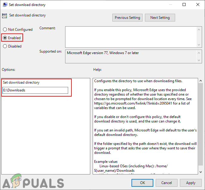 Navigating to the setting - Double-click on the setting named “Set download directory” and it will open up in another window. Now you need to change the toggle option from Not Configured to Enabled.