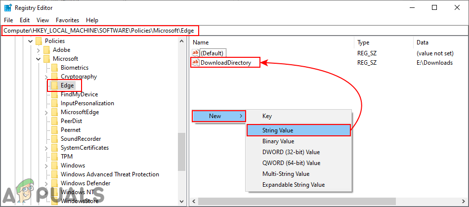Creating the missing key - Now right-click on the right pane of the Edge key and choose the New > String Value option. You need to rename this value as “DownloadDirectory“.