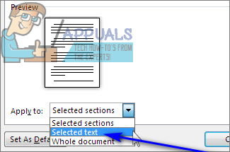 - Open the dropdown menu located right next to the Apply to: option and click on Selected text. This will signal Microsoft Word to only change the orientation of the text that has been selected.