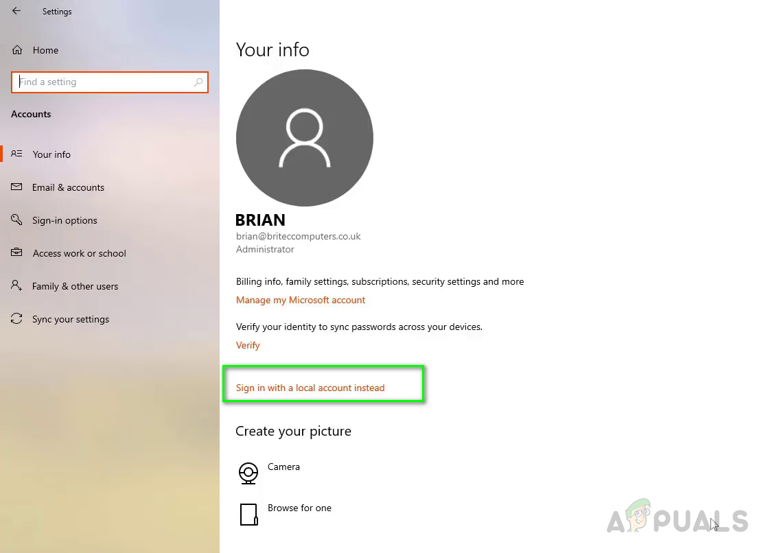 - Click on Accounts and then select Sign in with a local account instead.