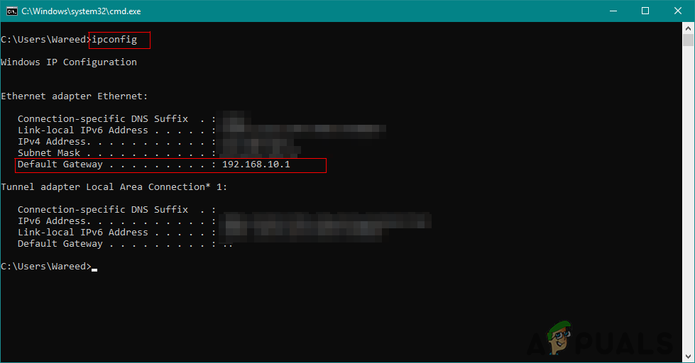 - Open your browser and type the IP address of your Router. You can find the IP address on the back of the router or by opening CMD and typing ‘ipconfig‘ as shown below: