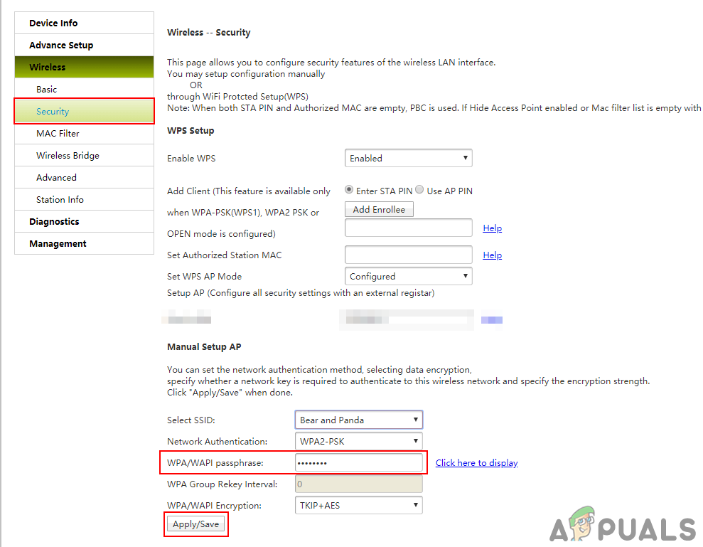 Changing the Wireless Network Name - To change the password, go to the Security option for Wireless settings. Type the new password that you prefer and click on the Apply/Save button.