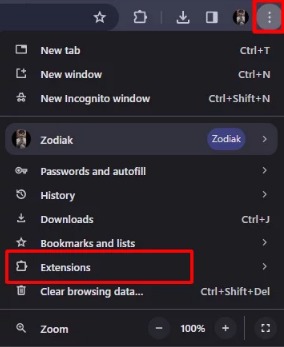 - Open your browser, click the three vertical dots, and go to More tools, then Extensions.