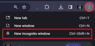 - In your browser, click on the three vertical dots and select New incognito window or New Private Window, depending on your browser.