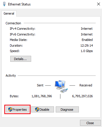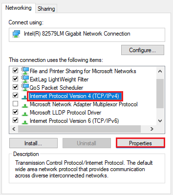 - Locate and highlight Internet Protocol Version 4 (TCP/IPv4) and click Properties.