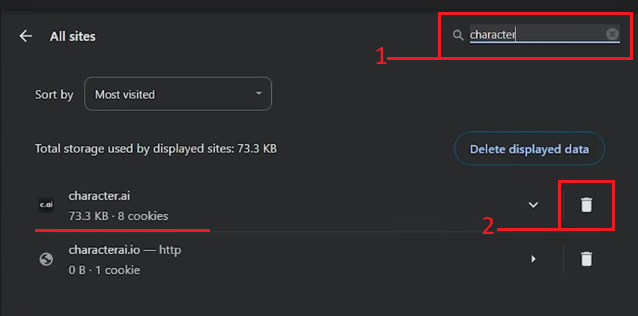 - In the search box, type “Character.AI” and proceed to clear its cache.
