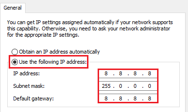 - Change the selection from Obtain DNS server address automatically to Use the following DNS server addresses. Input new DNS addresses—such as 8.8.8.8 or 1.1.1.1—and click OK to save the changes.