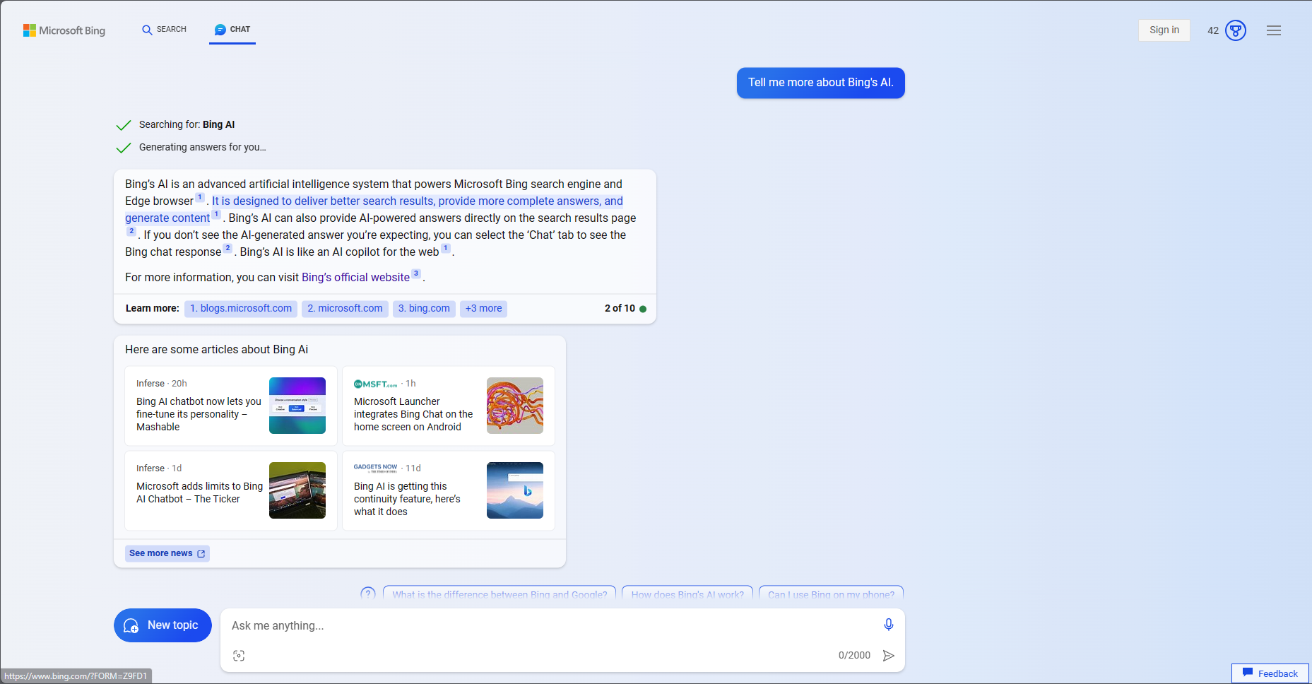 - Bing AI: One of the first chatbots to use GPT-4 technology is Microshoft’s Bing AI. The upgraded search engine answers user queries with simpler information. Apart from this, it can also handle visuals, connect to the internet, and even cite sources making it the ultimate alternative to ChatGPT.