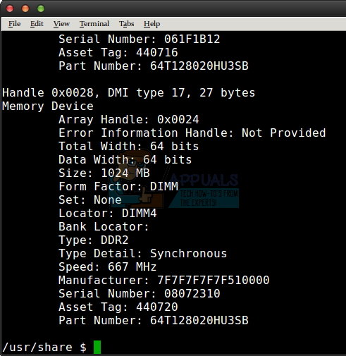 Once you done reviewing that information, type sudo dmidecode -t 17 and push enter to receive a complete list of physical cards plugged into the RAM slots on your computer. This will also tell you if you’re using DIMM, SODIMM or some other class of RAM cards. As long as that provided you with the information you needed you can close out the window right here and finish. Two commands was all it took to get the information you were looking for, and even then with an absolute minimal amount of playing around.
