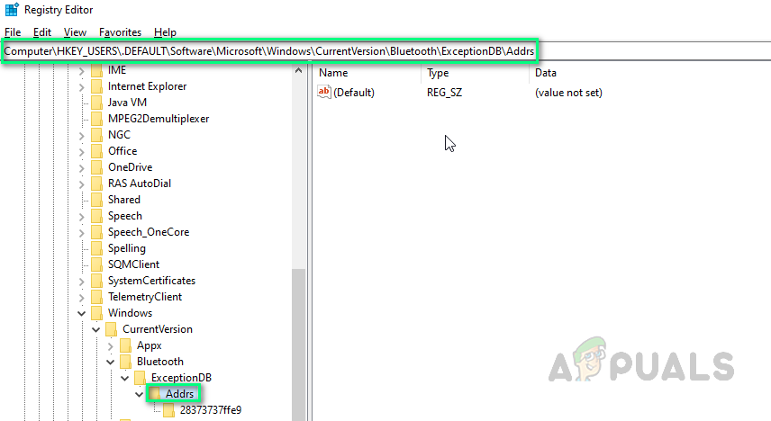 Computer\HKEY_USERS\.DEFAULT\Software\Microsoft\Windows\CurrentVersion\Bluetooth\ExceptionDB\Addrs