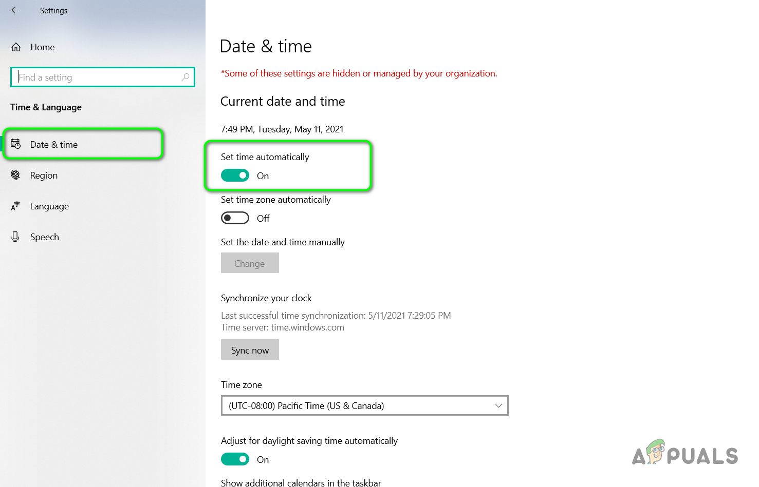 Select Time & Language in Windows Settings - In the Date & Time section, make sure you have the correct Time Zone Selected and that the option Set Time automatically is turned on.