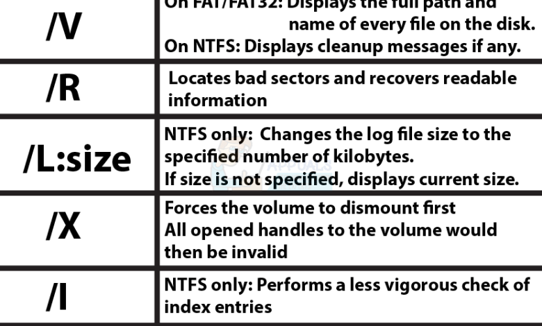 The format for using these commands is chkdsk [/?]. Where “?” will be replaced with the option that you want to use.