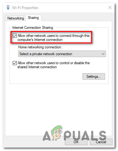 If this scenario is applicable to your particular scenario, several affected users have managed to fix this issue by accessing the Network Connections tab and modifying the default Sharing configuration so that network connection sharing is not allowed.