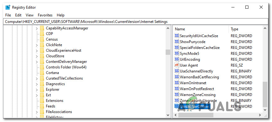 - Once you get to the correct location, move down to the right-hand side section and locate the GlobalUserOffline DWORD key.