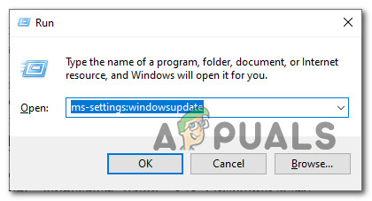- Press Windows key + R to open up a Run dialog box. Next, type “ms-settings:windowsupdate” inside the text box and press Enter to open up the Windows Update screen of the Settings app.