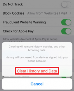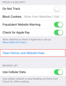 - After you tap on the Safari entry, scroll all the way down and tap on Clear History and Website Data.