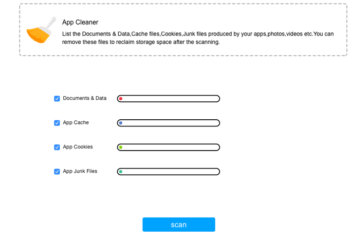 - Now click on Scan. The software will automatically look for an app any app cache, junk files, and other redundant documents. When the query ends, you will be given the choice to remove all the files that have just been analyzed.