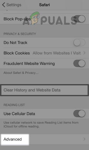 - Now tap on Advanced and select Website Data.