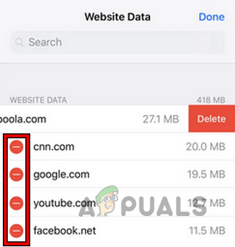 Open Website Data in the Advanced Settings of Safari on iPhone - Once the required cookies are selected, tap on Delete to delete the problematic cookies.