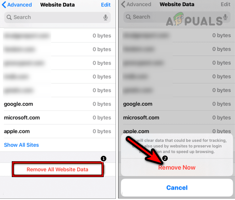 - Then tap on Remove All Website Data at Once and afterward, confirm to remove the website data.