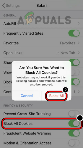 - Now enable Block All Cookies by toggling its switch to the ON position and then confirm to block all the cookies.