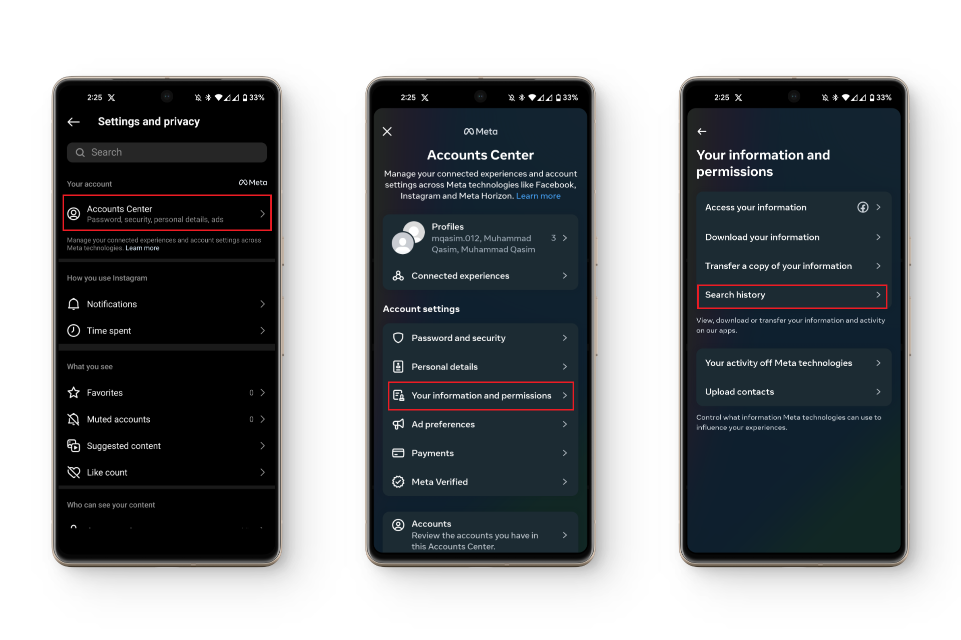 Accessing Instagram Settings - Tap on Accounts Center and select “Your information and permissions“
