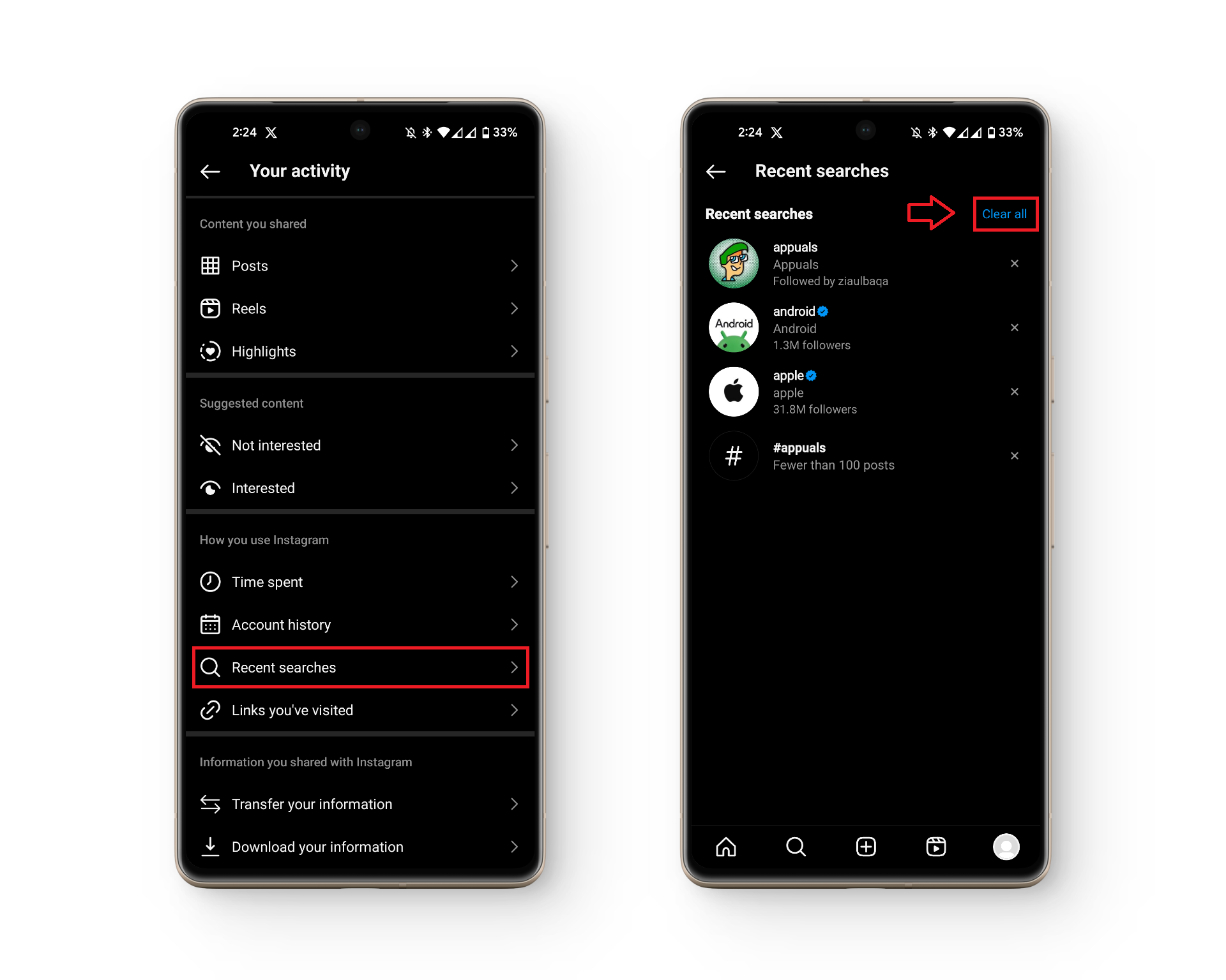 Instagram also provides you with a way to clear your entire search history in one tap using the “Your Activity” setting. However, make sure you don’t delete anything you might need to refer to later. Analyze your searches before following the steps below.