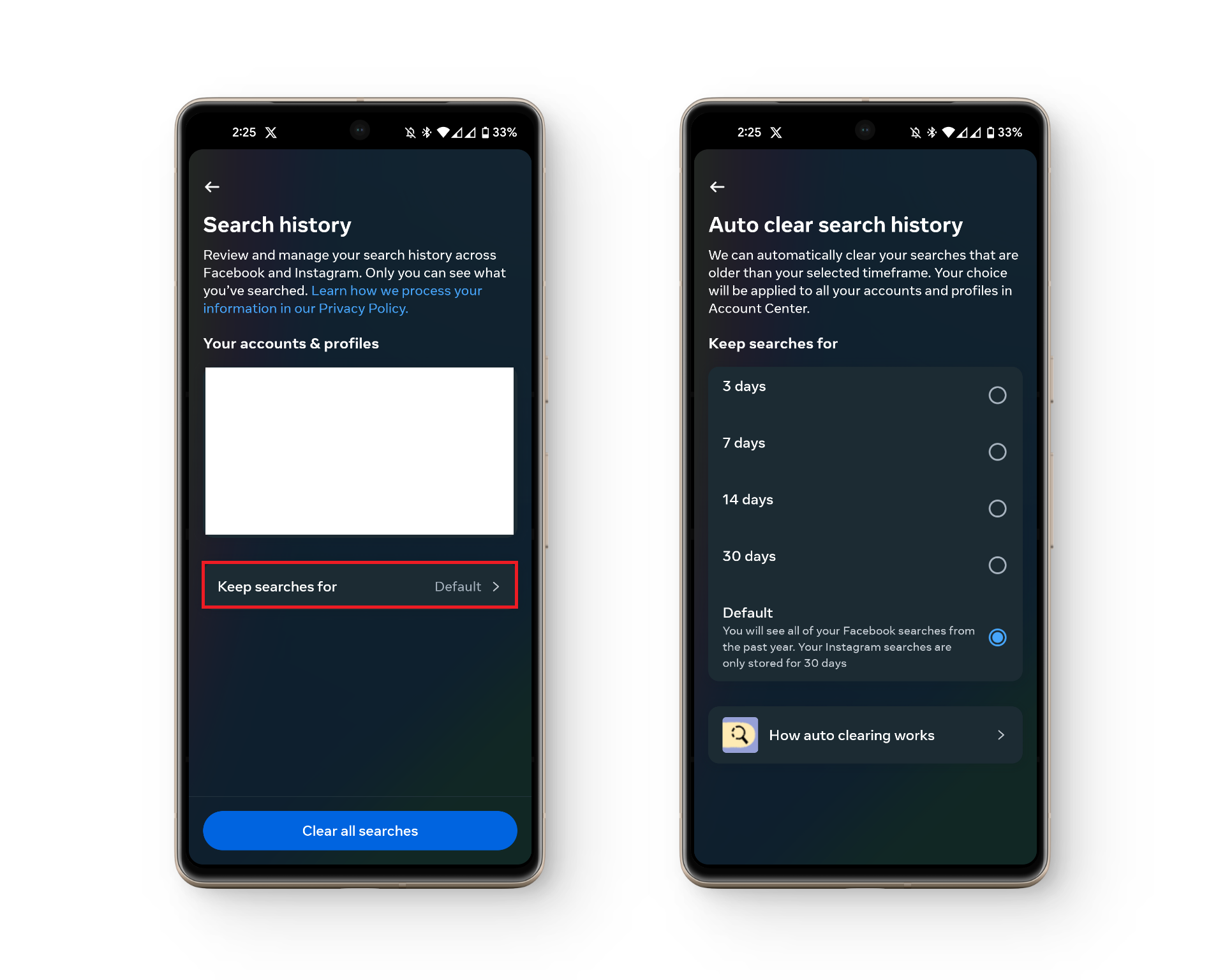 If you don’t want to go through the hassle of manually deleting every search result, or repeating the process every couple of days, Instagram allows you to auto-delete your search history for you after a defined time period.