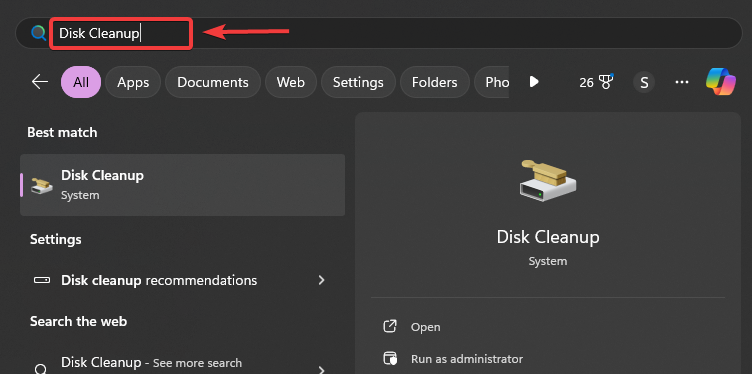 - Press the Win key to open up the Start Menu and type Disk Cleanup in the Windows search bar.