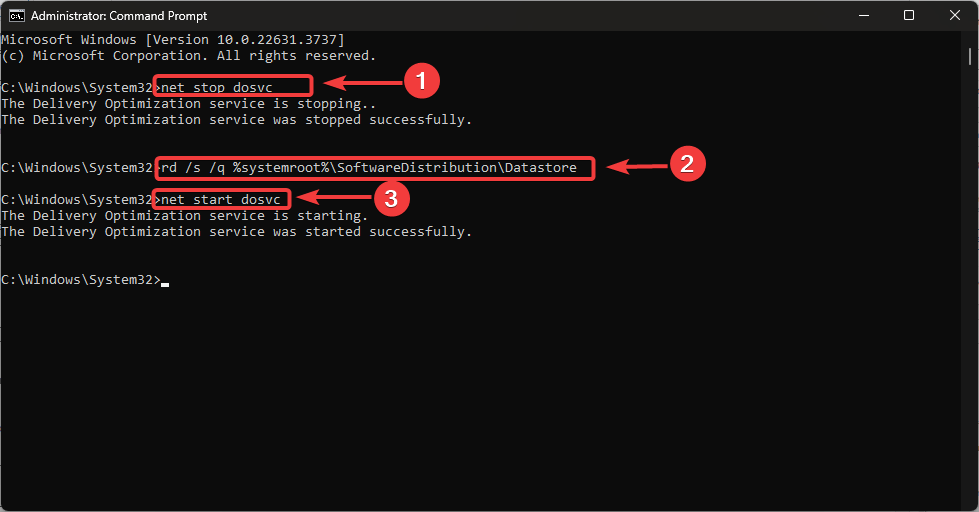 net stop dosvc rd /s /q %systemroot%\SoftwareDistribution\Datastore net start dosvc